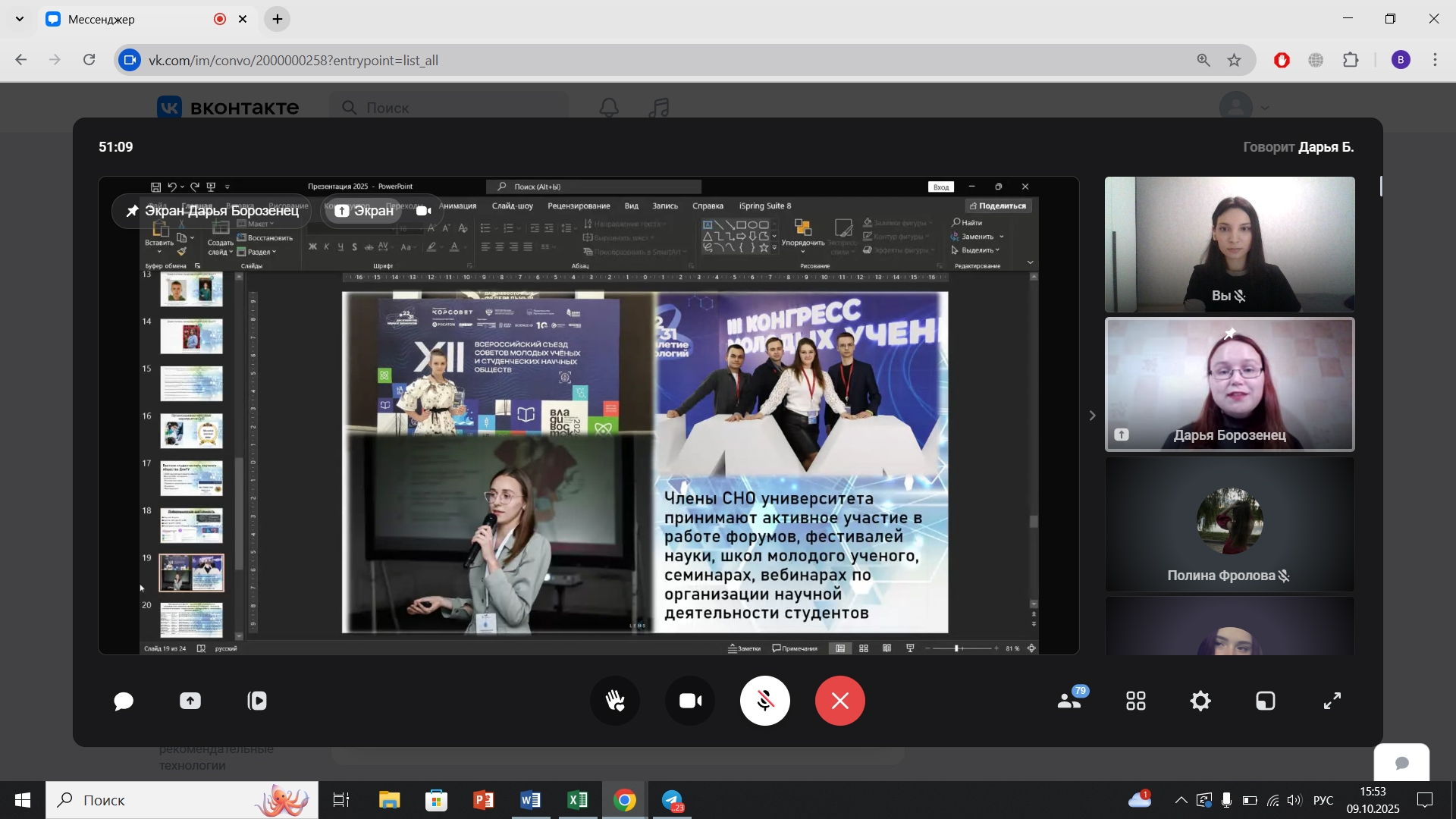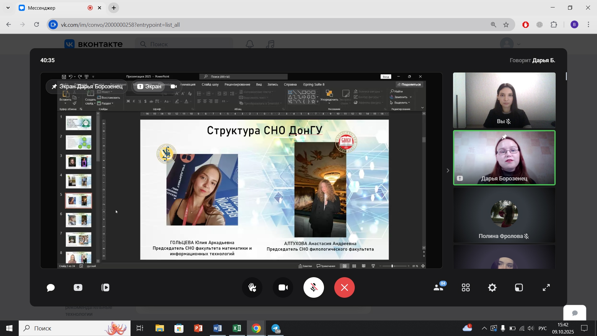 Завершила встречу с первокурсниками куратор СНО Дарья Борозенец. Она рассказала о проектах, которые регулярно проводит общество, назвала его цели и задачи, а также обобщила сказанное ранее. Из этого рассказа первокурсники узнали о возможности участия в научных конференциях, грантовых программах и других всероссийских проектах.