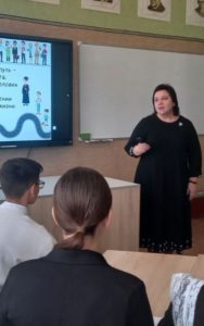 20 октября в шахтерской школе № 22 прошло профориентационное мероприятие в рамках проекта «Билет в будущее» национального проекта «Молодежь и дети» «Есть такая профессия – учитель», которое провели преподаватели кафедры дошкольного и начального педагогического образования института педагогики Донецкого государственного университета Ирина Матузова и Инна Карпушина с советником Главы ДНР, доцентом кафедры Мариной Борисюк. Цель интерактива – познакомить учащихся психолого-педагогических классов с профессией педагога, её особенностями и преимуществами, а также мотивировать к выбору данной профессии.