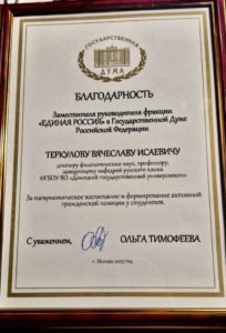 16 октября в рамках Ставропольского форума Всемирного Русского Народного Собора, посвященного Великой Победе и констатирующего ответственность перед историей и будущим, состоялось заседание секции «Медиакоммуникации в условиях информационной войны: технологии защиты и противостояния», на котором заведующий кафедрой русского языка профессор Вячеслав Теркулов представил доклад «Язык как транслятор этнокультурных кодов в условиях информационного противостояния». Доклад вызвал большой интерес среди участников конференции. Кроме того, 17 числа заместитель руководителя фракции «Единая Россия» в Государственной Думе РФ Ольга Тимофеева вручила Вячеславу Исаевичу Благодарность за патриотическое воспитание и формирование активной гражданской позиции у студентов.