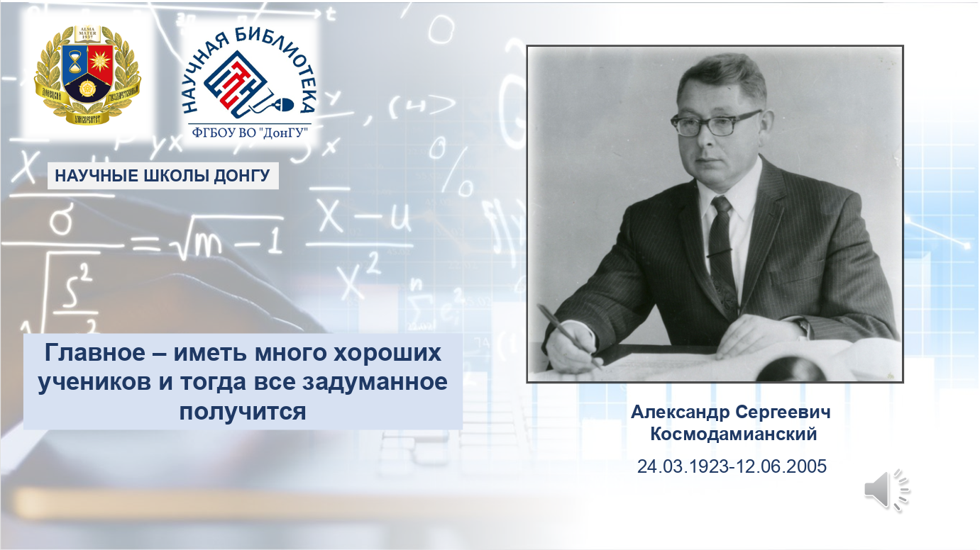 Ко Дню преподавателя высшей школы Научная библиотека представляет виртуальную выставку изданий, посвященную Александру Сергеевичу Космодамианскому, в рамках проекта «Научные школы ДонГУ».