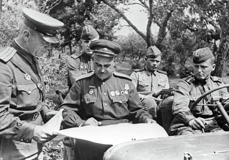Командир 15-го стрелкового корпуса генерал-майор Иван Ильич Людников (второй слева) и начальник оперативного отделения корпуса подполковник Павел Михайлович Живодеров уточняют боевую обстановку. Курская битва.