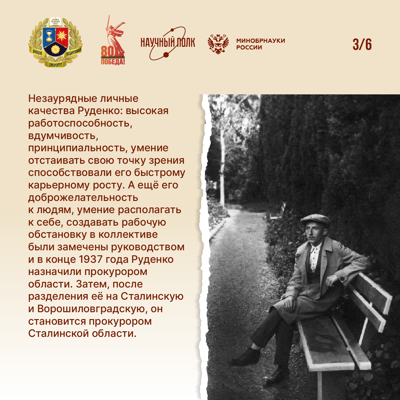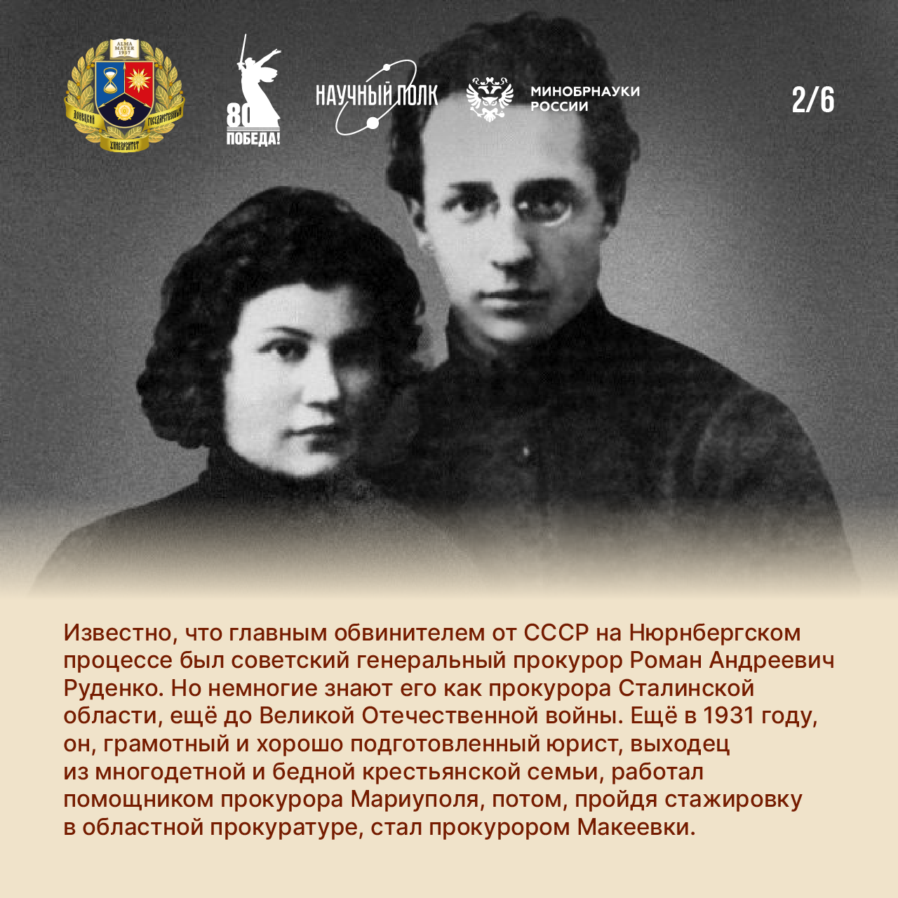 Известно, что главным обвинителем от СССР на Нюрнбергском процессе был советский генеральный прокурор Роман Андреевич Руденко. Но немногие знают его как прокурора Сталинской области, ещё до Великой Отечественной войны. Ещё в 1931 году, он, грамотный и хорошо подготовленный юрист, выходец из многодетной и бедной крестьянской семьи, работал помощником прокурора Мариуполя, потом, пройдя стажировку в областной прокуратуре, стал прокурором Макеевки.
