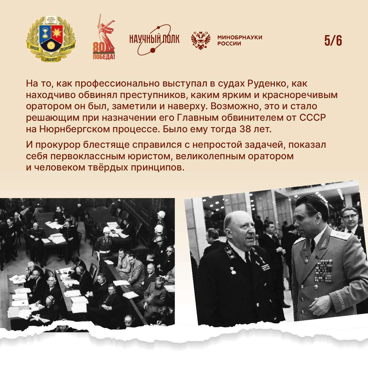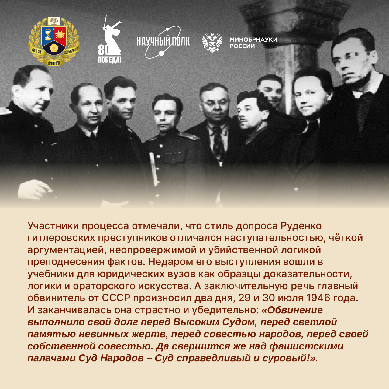 На то, как профессионально выступал в судах Руденко, как находчиво обвинял преступников, каким ярким и красноречивым оратором он был, заметили и наверху. Возможно, это и стало решающим при назначении его Главным обвинителем от СССР на Нюрнбергском процессе. Было ему тогда 38 лет.  И прокурор блестяще справился с непростой задачей, показал себя первоклассным юристом, великолепным оратором и человеком твёрдых принципов.