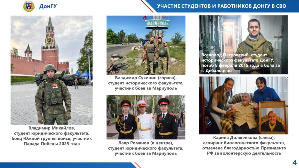 В 2014 году, когда формировались отряды добровольцев для создания народного ополчения Республики, университет пополнял кадрами ряды Народной Милиции (армии ДНР): более тысячи наших преподавателей, студентов и выпускников ушло на фронт для борьбы с украинским фашизмом. Из них более семисот — стали участниками и ветеранами специальной военной операции.