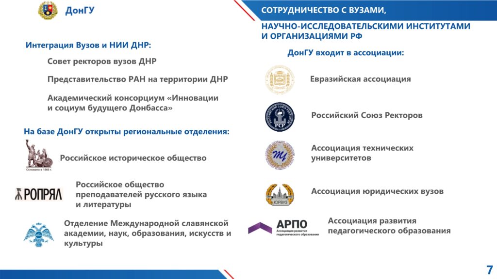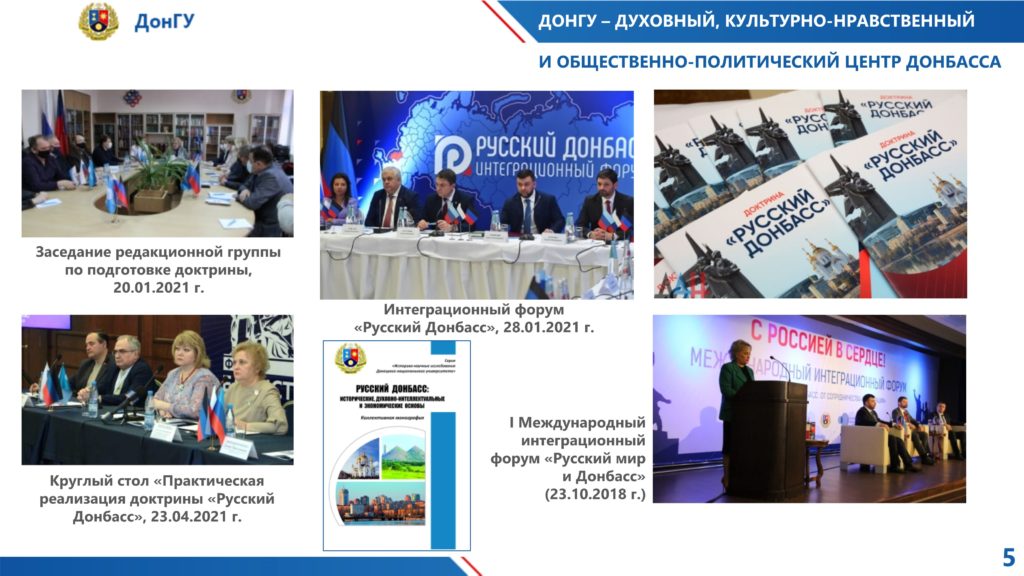 В этом же ряду – организованные и успешно проведенные совместно с органами власти Республики Международные интеграционные форумы «Русский мир и Донбасс: от сотрудничества к интеграции образования, науки, инноваций и культуры» с широчайшей повесткой дня – от научно-образовательного взаимодействия до достижения целей интеграции в области экономики, промышленной кооперации, духовной сферы, культуры, спорта.