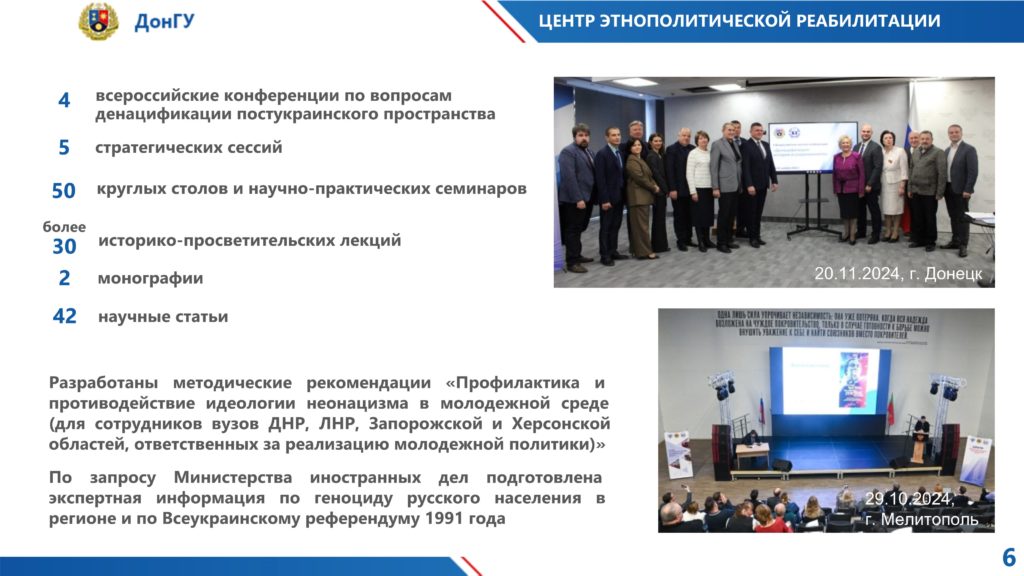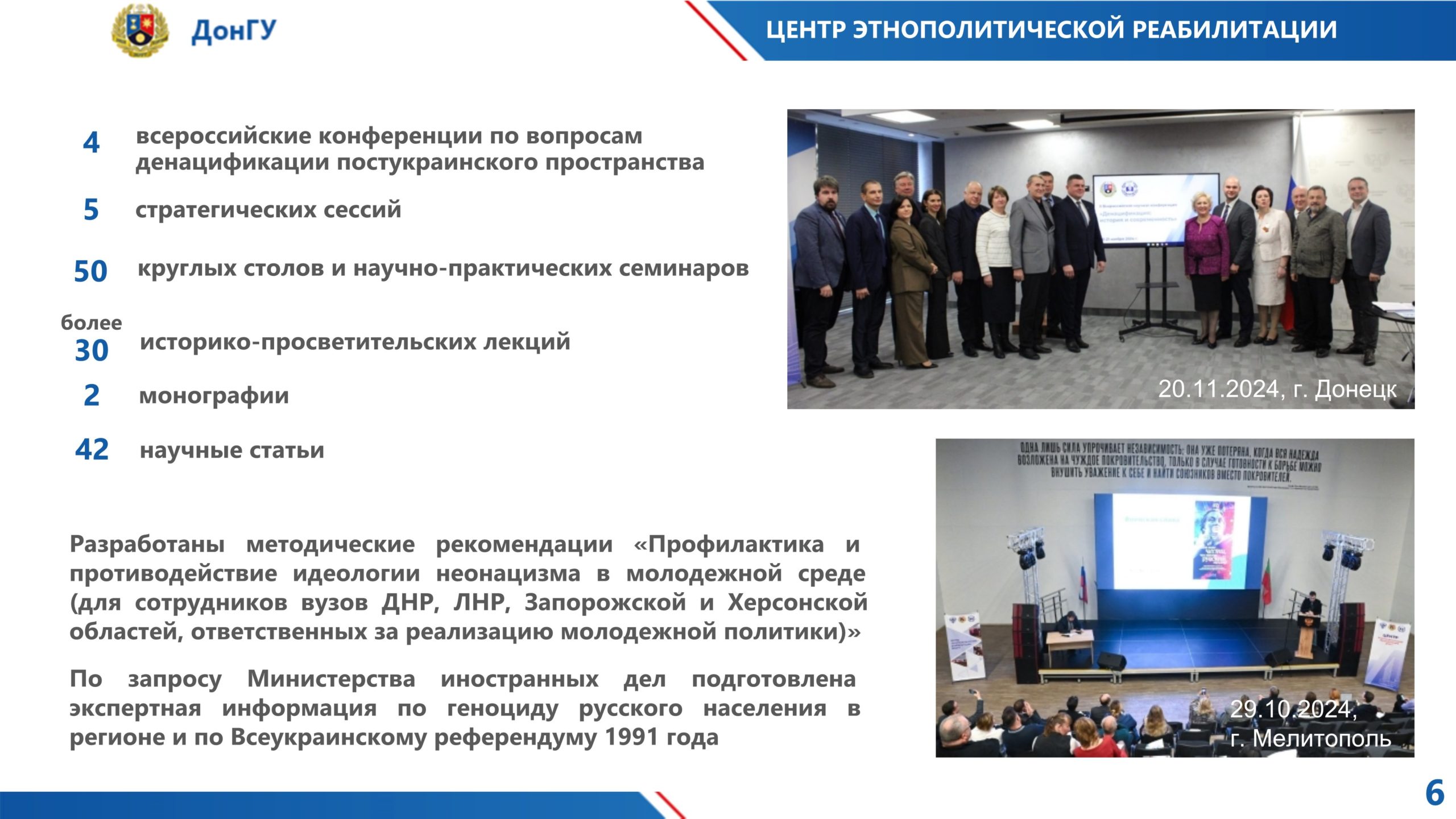 Сотрудники университета принимают участие в ее решении. Созданный Научно-образовательный Центр этнополитической реабилитации проводит научные исследования украинского национализма, переродившегося в современных условиях в новую модификацию нацизма; экспертно-аналитическое, консультационное, научно-методическое сопровождение денацификации постукраинского пространства.