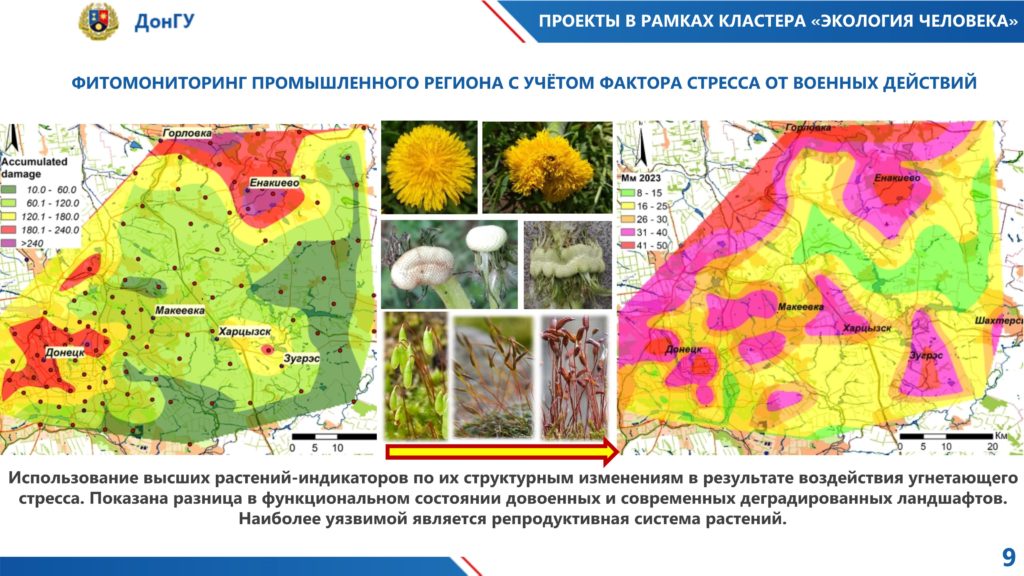 Слайд иллюстрирует некоторые результаты фитомониторинга, которые лягут в основу восстановления экосистемы Донбасса.