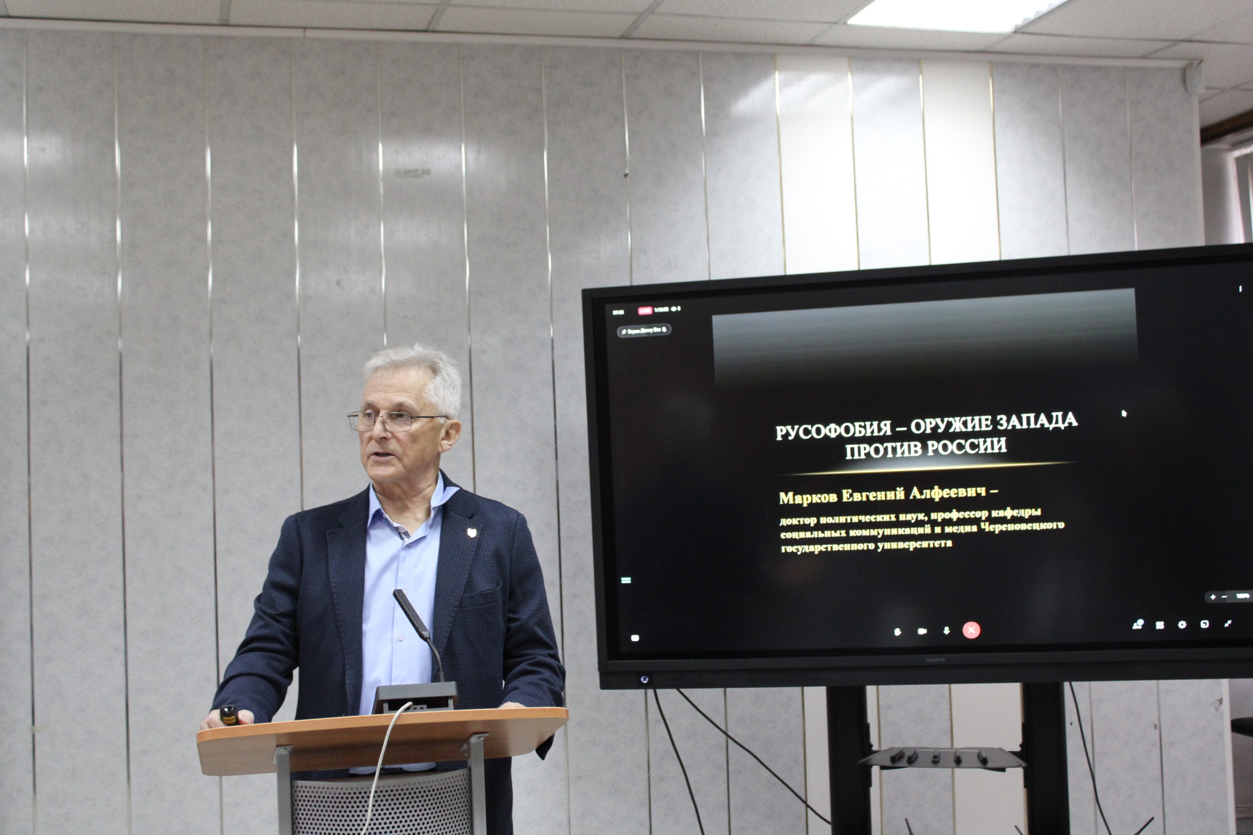 Профессор кафедры социальных коммуникаций и медиа Гуманитарного института Череповецкого государственного университета Евгений Марков подготовил доклад о русофобии как оружии Запада против России. Ученый рассказал об устойчивых русофобских мифах, которые культивируются в Европе. Детально рассмотрел русофобию на Украине как явление и дал свои рекомендации по борьбе с русофобией.