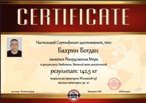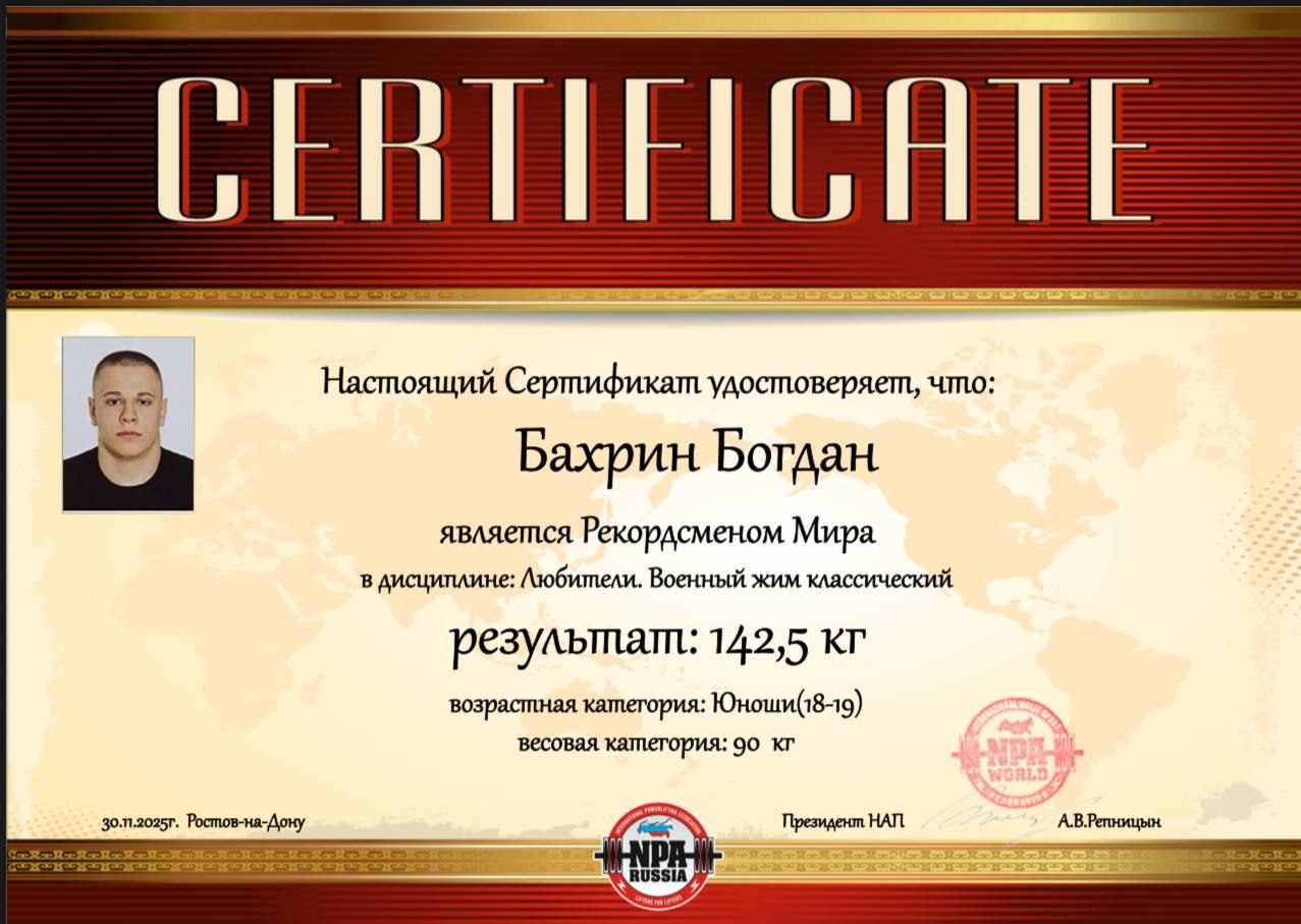 29-30 ноября в Ростове-на-Дону проходил Всероссийский чемпионат по пауэрлифтингу и пауэрспорту «Ростовская крепость». Студент 1 курса экономического факультета Богдан Бахрин стал победителем данных соревнований, установив мировой рекорд 142,5 кг в дисциплине «Военный жим» (категория: юноши 18-19 лет, 90 кг).