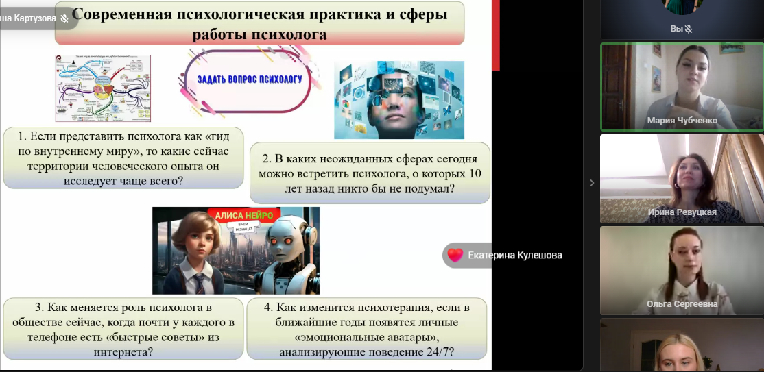 Форум стал площадкой живого диалога о современных вызовах психологической практики, роли психолога в цифровом обществе и разнообразии психотерапевтических направлений. В обсуждении приняли участие ведущие специалисты в области клинической, практической, арт-терапевтической, психоаналитической и кризисной психологии, а также студенты старших курсов, что подчеркнуло преемственность поколений и ценность профессионального роста.