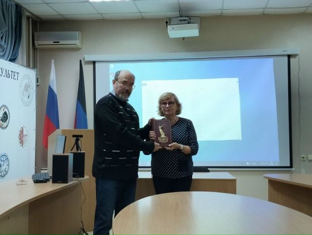 В заседании Совета регионального отделения Российского исторического общества приняла участие заведующая военно-историческим музеем Великой Отечественной войны (отдел ГБУ ДНР «Донецкий республиканский краеведческий музей») Людмила Декурно. Ей передали экземпляр монографии «Народы Советского Союза и Великая Победа 1941–1945 гг.».