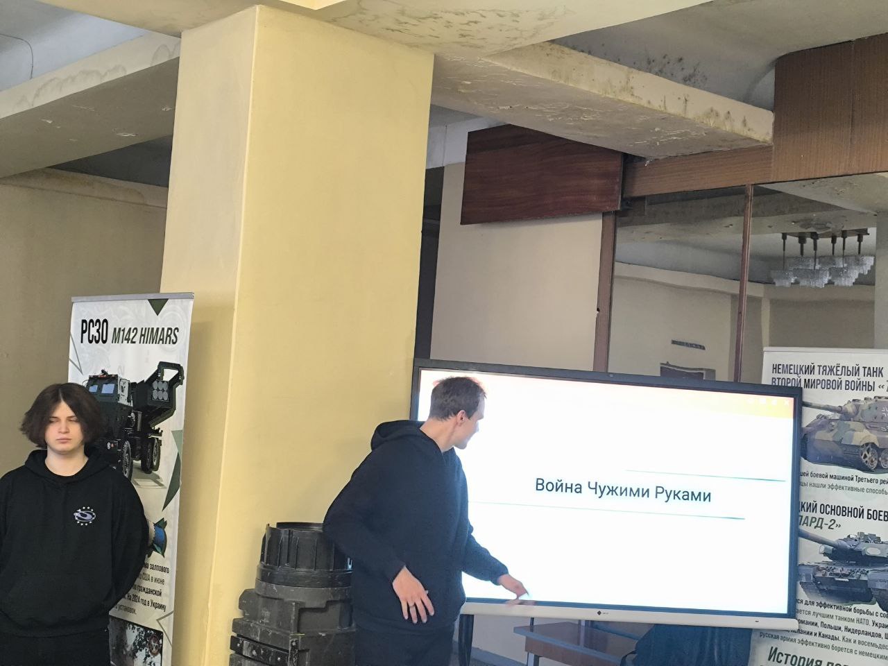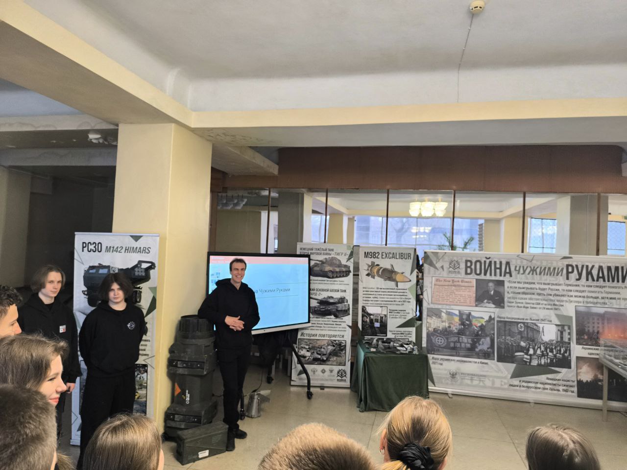 На выставке представлены экспонаты вооружения НАТО и США, которые применяются против российской армии и российского народа — осколки снарядов, беспилотники, гранатометы и информационные планшеты.