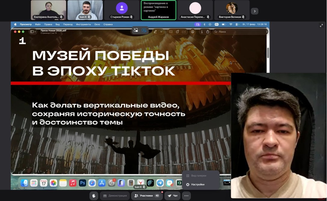 Во время встречи спикер организовал LIVE-экскурсию по Музею Победы, показал ряд видеороликов, наглядно демонстрирующих возможности вертикального контента. На примерах рилсов участники разобрали принципы работы с форматом, поговорили о структуре короткого видео и познакомились с приёмами, которые можно применять уже в ближайших съемках.