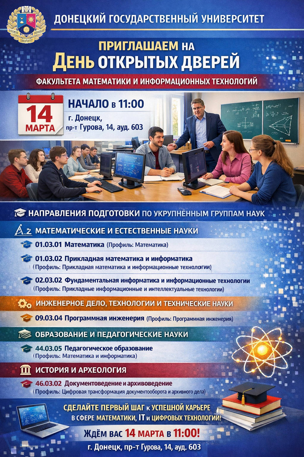 14 марта в 11:00 в аудитории 603 главного корпуса ДонГУ состоится День открытых дверей факультета математики и информационных технологий Донецкого государственного университета.