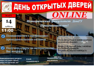 14 марта исторический факультет Донецкого государственного университета приглашает абитуриентов и их родителей на День открытых дверей ONLINE.